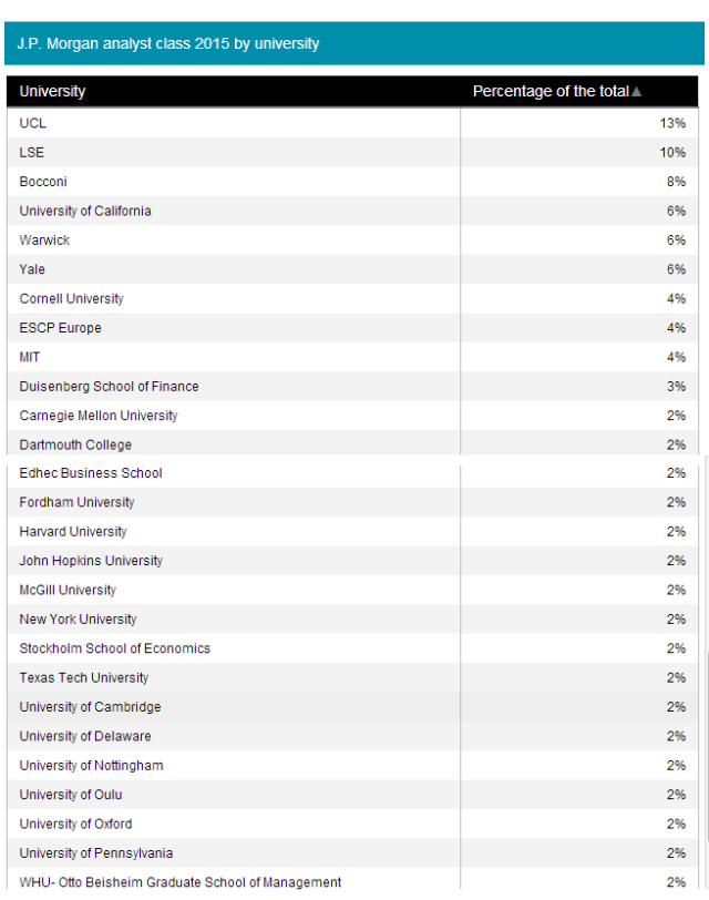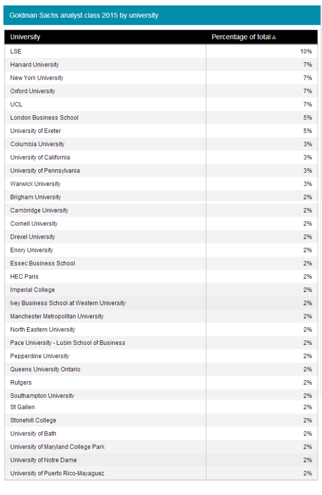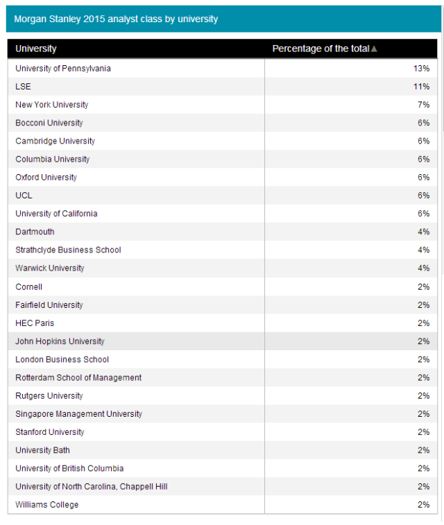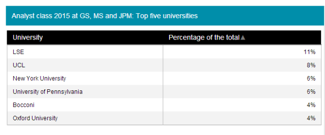 根據(jù)efinancialcareers(類似于智聯(lián)招聘的一個(gè)網(wǎng)站,他會(huì)統(tǒng)計(jì)客戶的專業(yè)背景,哪些公司會(huì)聘用怎樣水準(zhǔn)的人才),高盛集團(tuán),摩根大通,摩根士丹利三大投行招聘的2015 Analyst class名單中,基本已被全球高校的商科高材生‘霸屏’...錄用最多的5個(gè)高校: