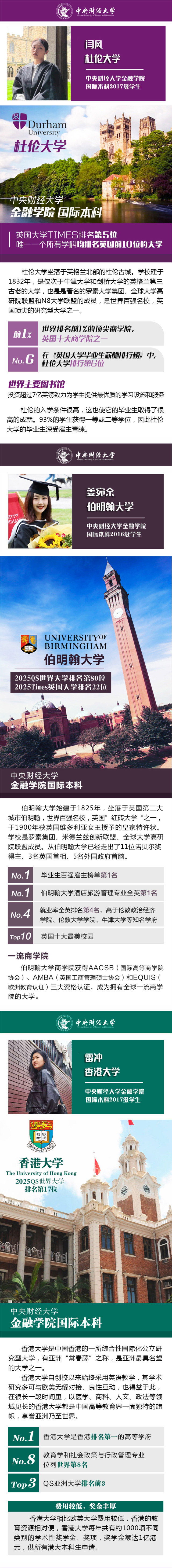 中央財(cái)經(jīng)大學(xué)始建于1949年,是教育部直屬、國家“雙一流”建設(shè)、“211工程”建設(shè)和首批“985優(yōu)勢(shì)學(xué)科創(chuàng)新平臺(tái)”項(xiàng)目建設(shè)高校。 中央財(cái)經(jīng)大學(xué)金融學(xué)科于2001年被教育部評(píng)定為國家級(jí)重點(diǎn)學(xué)科,2007年再次獲聘國家重點(diǎn)學(xué)科并支撐中央財(cái)經(jīng)大學(xué)應(yīng)用經(jīng)濟(jì)學(xué)科成為國家重點(diǎn)一級(jí)學(xué)科,2017年應(yīng)用經(jīng)濟(jì)學(xué)被確定為國家雙一流學(xué)科。 著經(jīng)濟(jì)全球化浪潮的快速推進(jìn),學(xué)校實(shí)施國際化戰(zhàn)略,大力開展多形式、錯(cuò)層次的國際交流與合作,已與遍及世界五大洲的高校、政府機(jī)構(gòu)、國際組織、跨國企業(yè)等190余家單位建立了密切的合作關(guān)系。 2017年,中國(教育部)留學(xué)服務(wù)中心與中央財(cái)經(jīng)大學(xué)簽署協(xié)議建立戰(zhàn)略合作關(guān)系,開展金融學(xué)院國際本科項(xiàng)目。